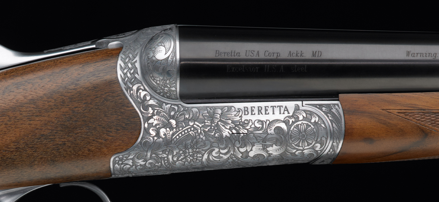 Beretta's 486 DS takes advantage of the latest 5 axis laser technology, which is capable of embellishing rounded surfaces while maintaining perfect continuity in the design. This type of highly figured, contrast effect engraving typically characterises premium shotguns. With the deep scroll motif extended to the receiver shoulders, top lever, trigger guard, forend iron and forend tip, the action of this gun is completely captivating. Additionally, the restyled gun benefits from Beretta's renowned Steelium barrels with their excellent ballistics, to create the most modern, reliable and sumptuous side by side.