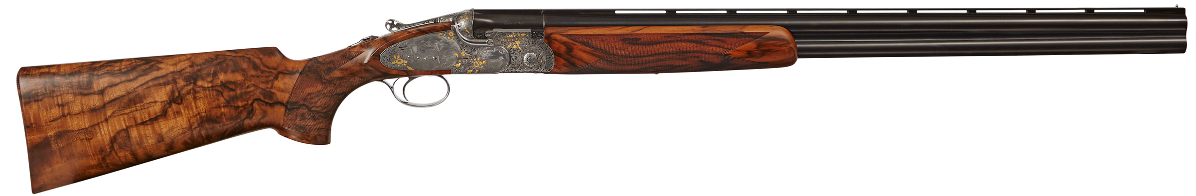 The action is beautifully crafted with a sturdy cross-bolt locking system designed for generations of use. The pistol grip, or English straight-hand stock and fore-end are carved from highly figured European walnut, and finished with a hand-cut, deep diamond checkering. A variety of sophisticated scenes and styles can be featured in the engravings upon the action, from floral motifs to traditional game scenes, fine English scrolls to gold-inlaid animals. The work of the master engraver results from centuries of tradition and experience.